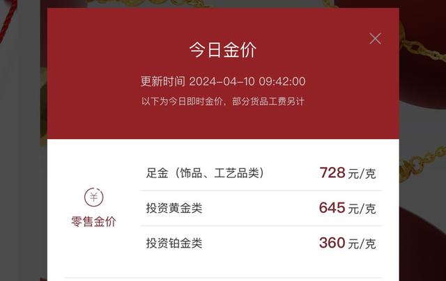 昨夜,伦敦金现盘中冲上2365美元/盎司,COMEX黄金盘中超过2384美元/盎司,双双刷新纪录。今天一早,杭城多家金店首饰金价已接近730元/克,周大福、曼卡龙(12.440, 0.62, 5.25%)等品牌都挂牌728元/克。