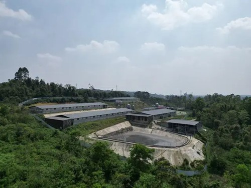 整个养殖场位于彭州市丽春镇塔子村8组一处山坡上,周围有养鸡场、花椒种植基地等。从高处俯瞰,养殖场内有三座蓝色顶棚的圈舍,类似蓄粪池等设施,布局规范,设施也比较新,整个场地目测面积约有上千平方米。养殖场下方,是岷江的支流蒲阳河、土漆河。