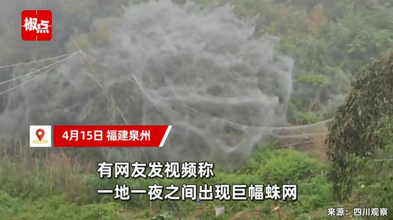 【福建一地一夜间出现巨幅蜘蛛网】4月15日,福建泉州一处地方一夜之间惊现巨幅蜘蛛网,其规模之大令人咋舌。据拍摄者描述,这张蜘蛛网目测面积达到了惊人的30多平米,引发了广泛关注。