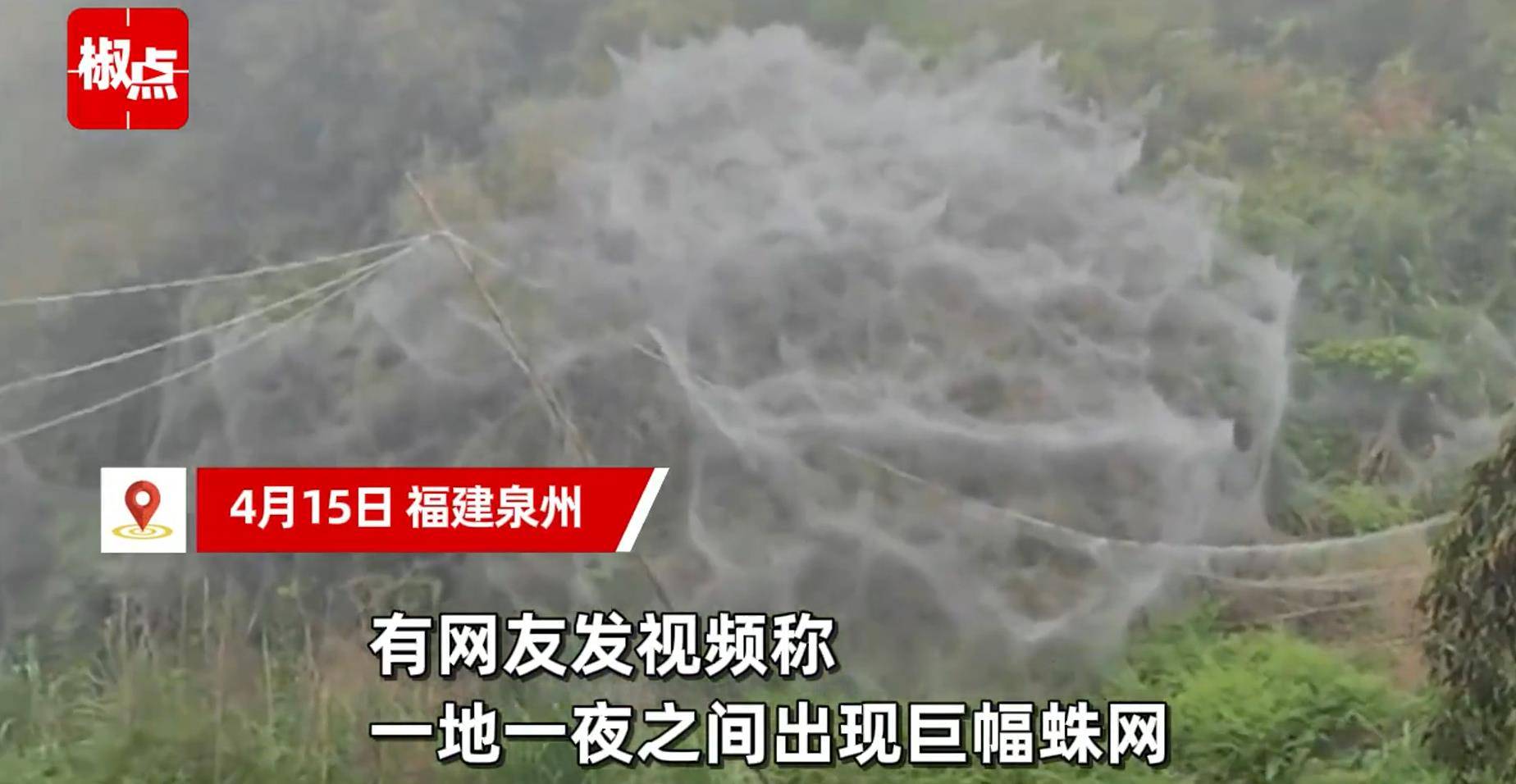 4月15日,福建泉州。一地一夜现巨幅蛛网,拍摄者称目测有30多平米。网友:起猛了看到现实版盘丝洞。