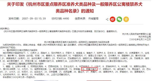《杭州市区重点限养区准养犬类品种及一般限养区公寓楼禁养犬类品种名录》(官网截图)