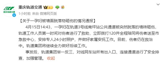 4月16日,重庆轨道交通官方微博发布通报称,4月15日14:43,一孕妇在轨道3号线南坪站公共通道被突然脱落的墙砖砸伤,轨道工作人员第一时间对伤者进行了救助,立即拨打120并全程陪同将伤者送至市急救中心,安排专人24小时照护,并做好家属安抚工作。目前,伤者仍在救治中。轨道集团将继续全力做好后续工作。事发后,轨道集团举一反三,对线网车站所有出入口、连接通道进行了安全排查,加强管理。