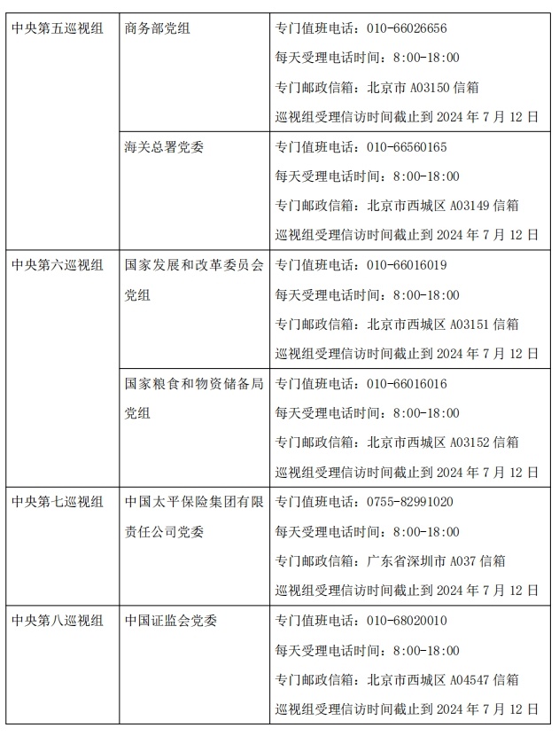 经党中央批准,二十届中央第三轮巡视将对国家发展和改革委员会、财政部、自然资源部、住房和城乡建设部、农业农村部、商务部、中国人民银行、审计署、海关总署、国家税务总局、国家市场监督管理总局、国家金融监督管理总局、中国证券监督管理委员会、国家统计局、国家知识产权局、国家粮食和物资储备局、国家能源局、国家林业和草原局、国家外汇管理局、中华全国供销合作总社、全国社会保障基金理事会、中国地质调查局、上海证券交易所、深圳证券交易所、中国进出口银行、中国工商银行股份有限公司、中国农业银行股份有限公司、中国银行股份有限公司、中国建设银行股份有限公司、交通银行股份有限公司、中国中信集团有限公司、中国人寿保险(集团)公司、中国太平保险集团有限责任公司、中国出口信用保险公司等34家单位党委(党组)开展常规巡视。
