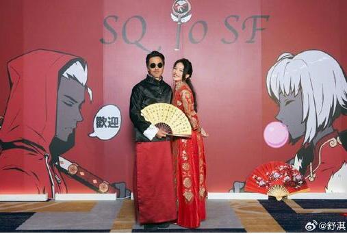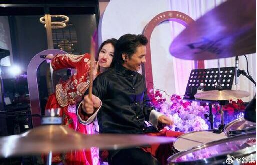 照片中两人穿中式礼服对嘴亲吻,冯德伦还为舒淇演奏架子鼓唱歌。